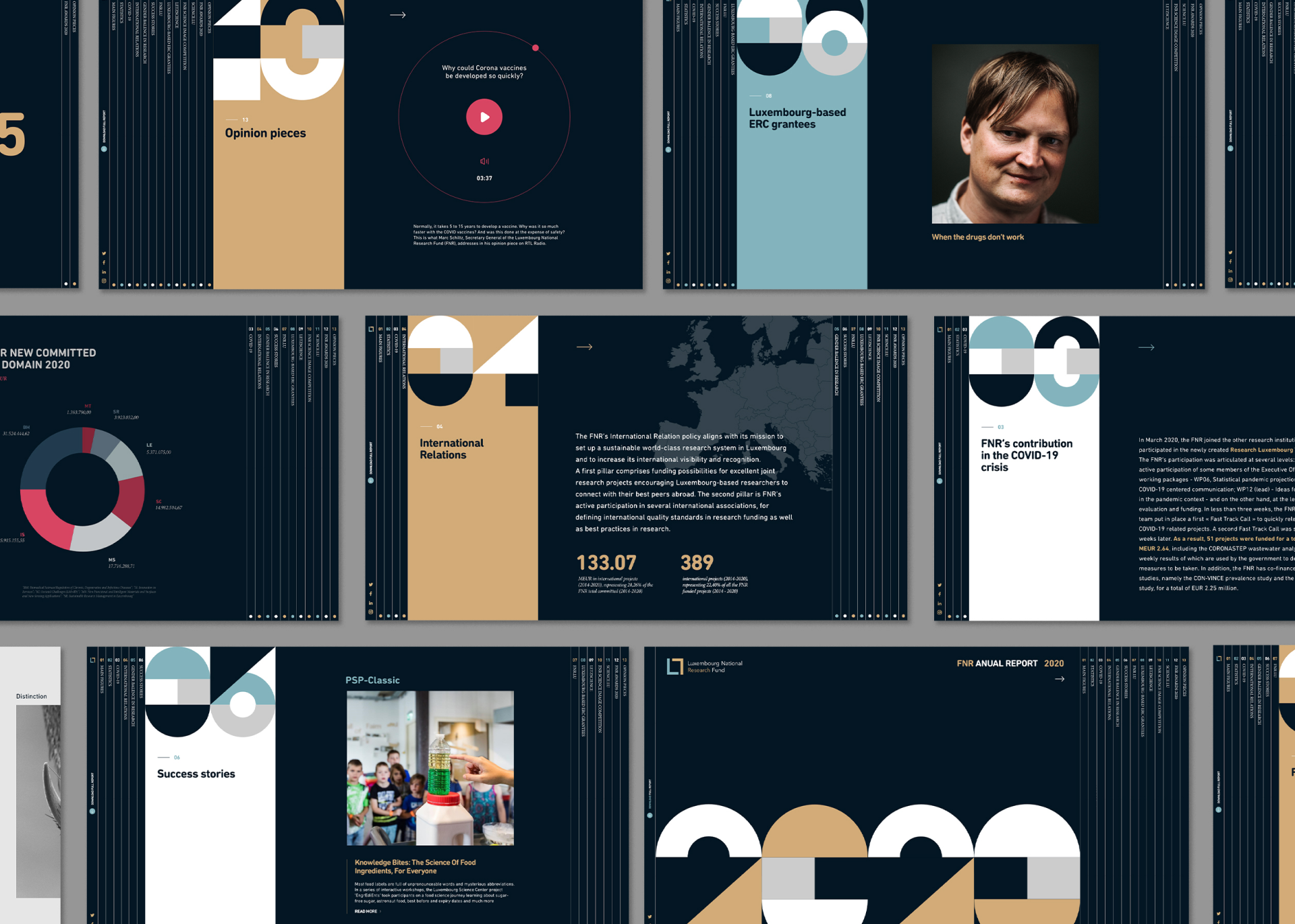 Create an annual report that is modern and content-rich. This activity report should be able to showcase the modernity of the National Research Fund and reflect the research industry in the Grand Duchy of Luxembourg. Above all, it should make the presentation of the research sector accessible to everyone.
