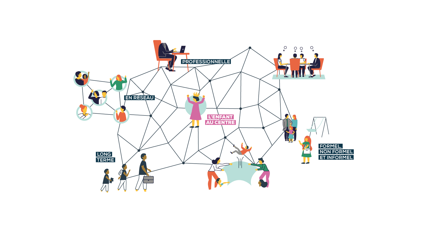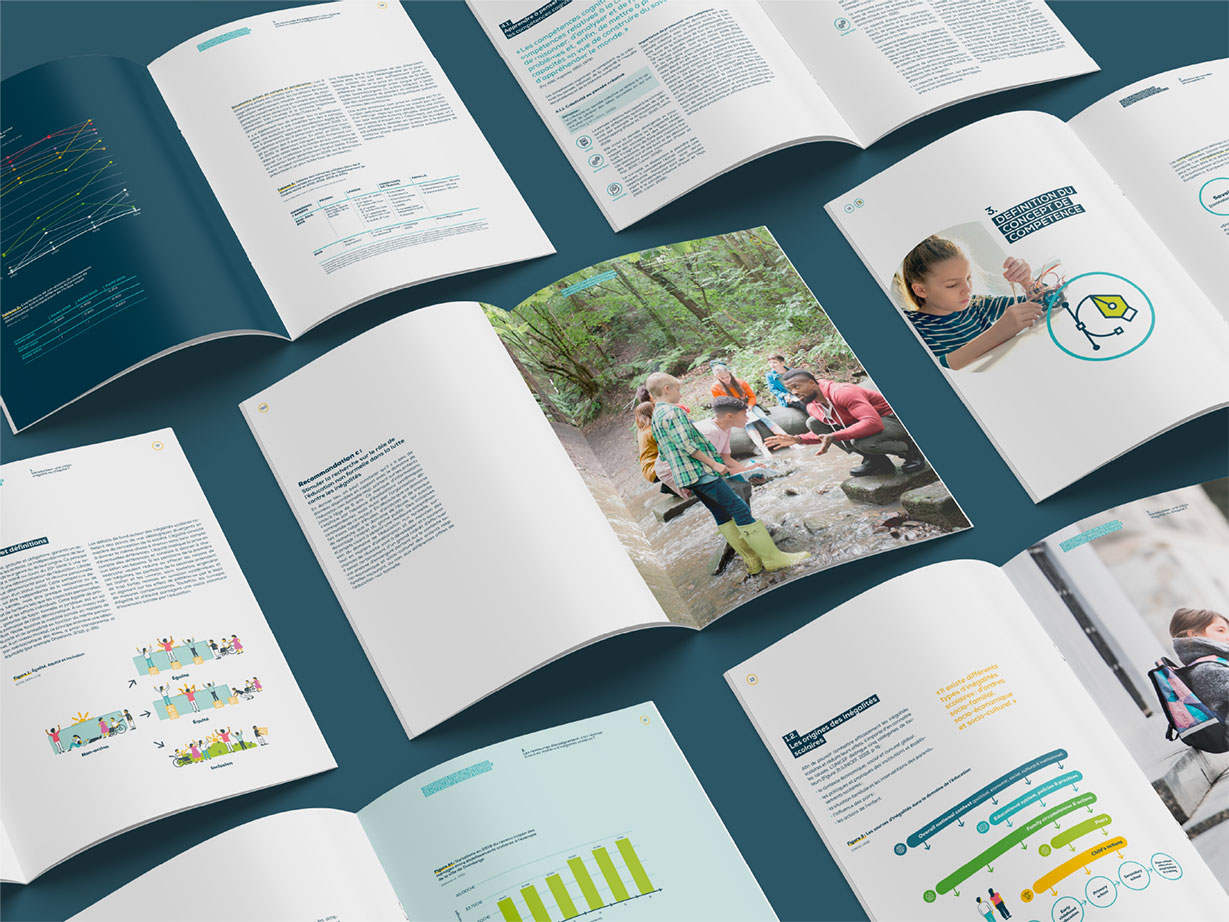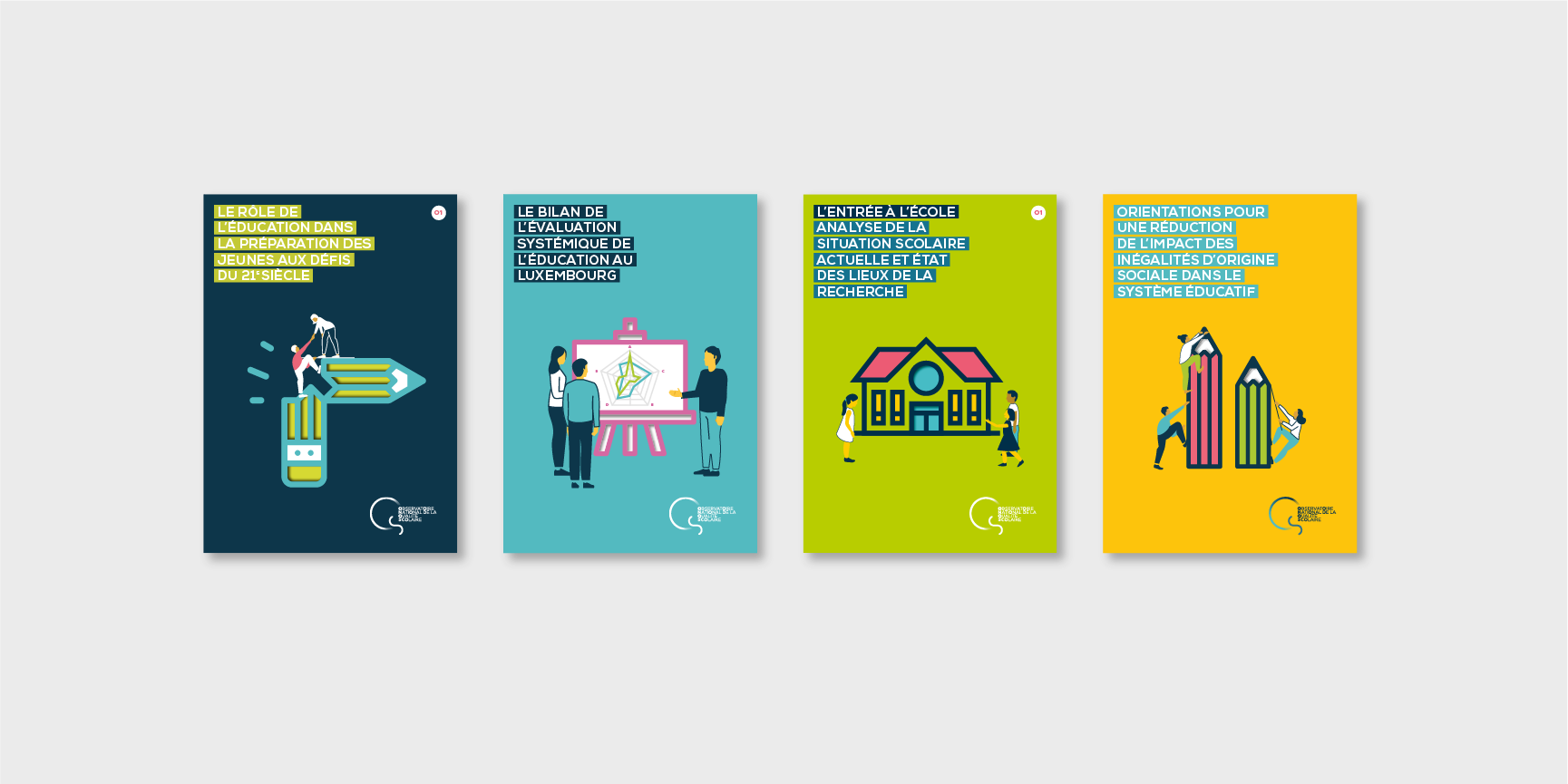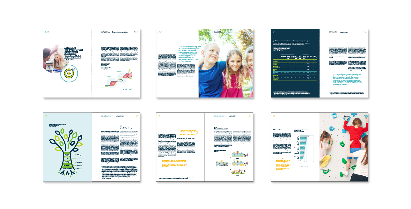 We opted for a colorful, positive, and lively graphic style. The design shows children, school related items and circular elements to maintain the distinctive identity of ONQS. The intention was to play with illustrations, sizes and proportions, to visually convey the theme explored in the report.
