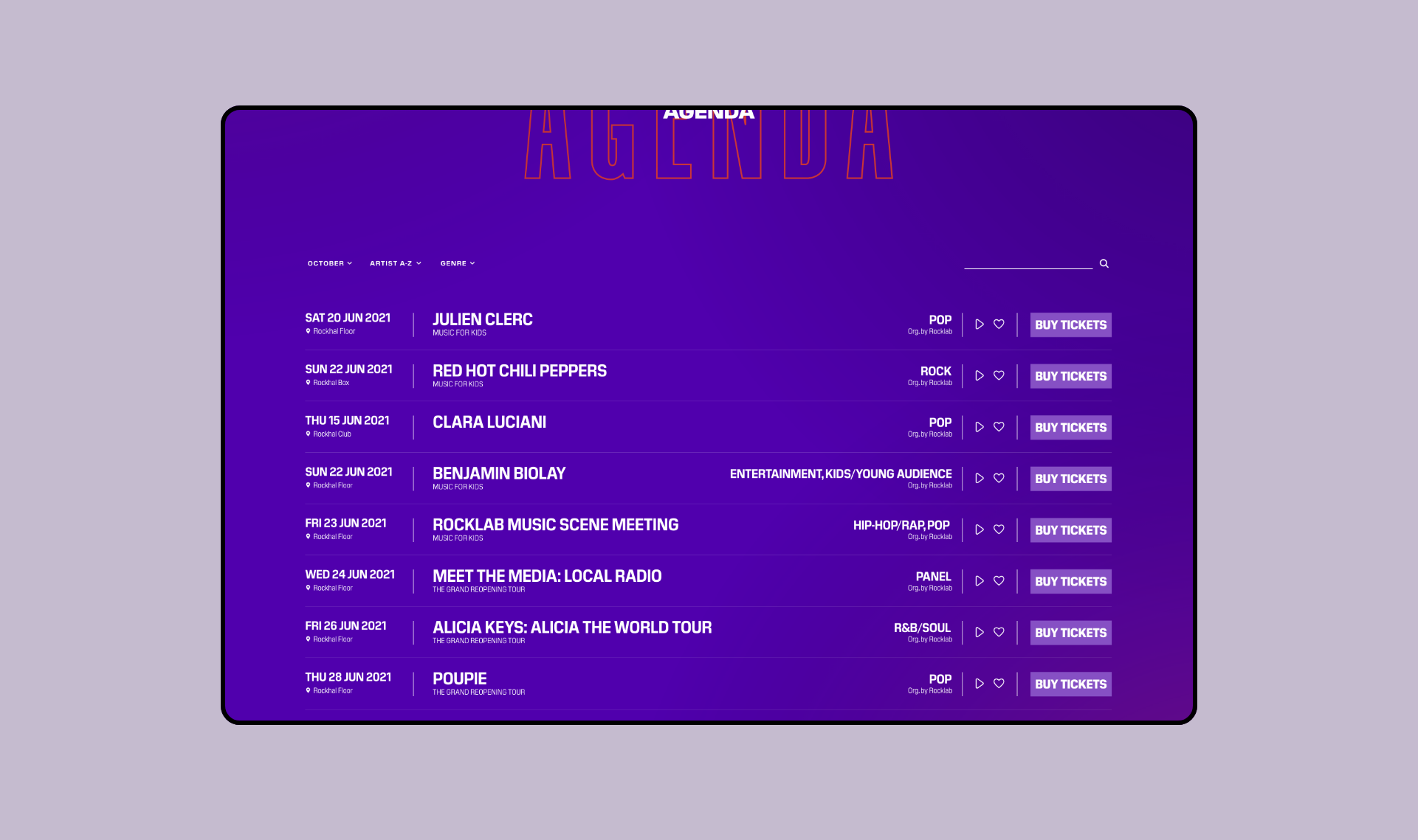 We designed the new website with a dynamic new look. Flashy colors and bold shapes, the identity of the music’s top figure is affirmed and catches the eye. The Agenda is the center of attention, putting the spotlight on the information that matters, where it matters. Just like music, obviously.