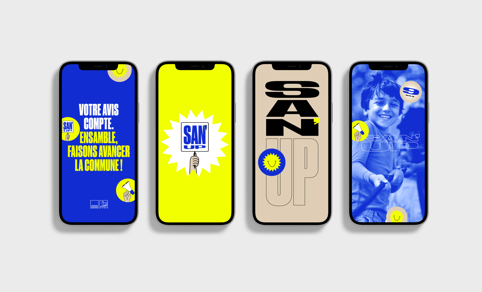 Today, it’s about involving these young people in the process so that their voices count and they feel that they too are making a difference, and being heard. With this perspective in mind, we’ve envisioned an entire concept around the three involved areas: a day of sharing and friendliness, marked by a spirit of fun. It’s in this vein that the entire identity has been conceived, from the name to the flashy visuals and typography inspired by the movement of standing up.